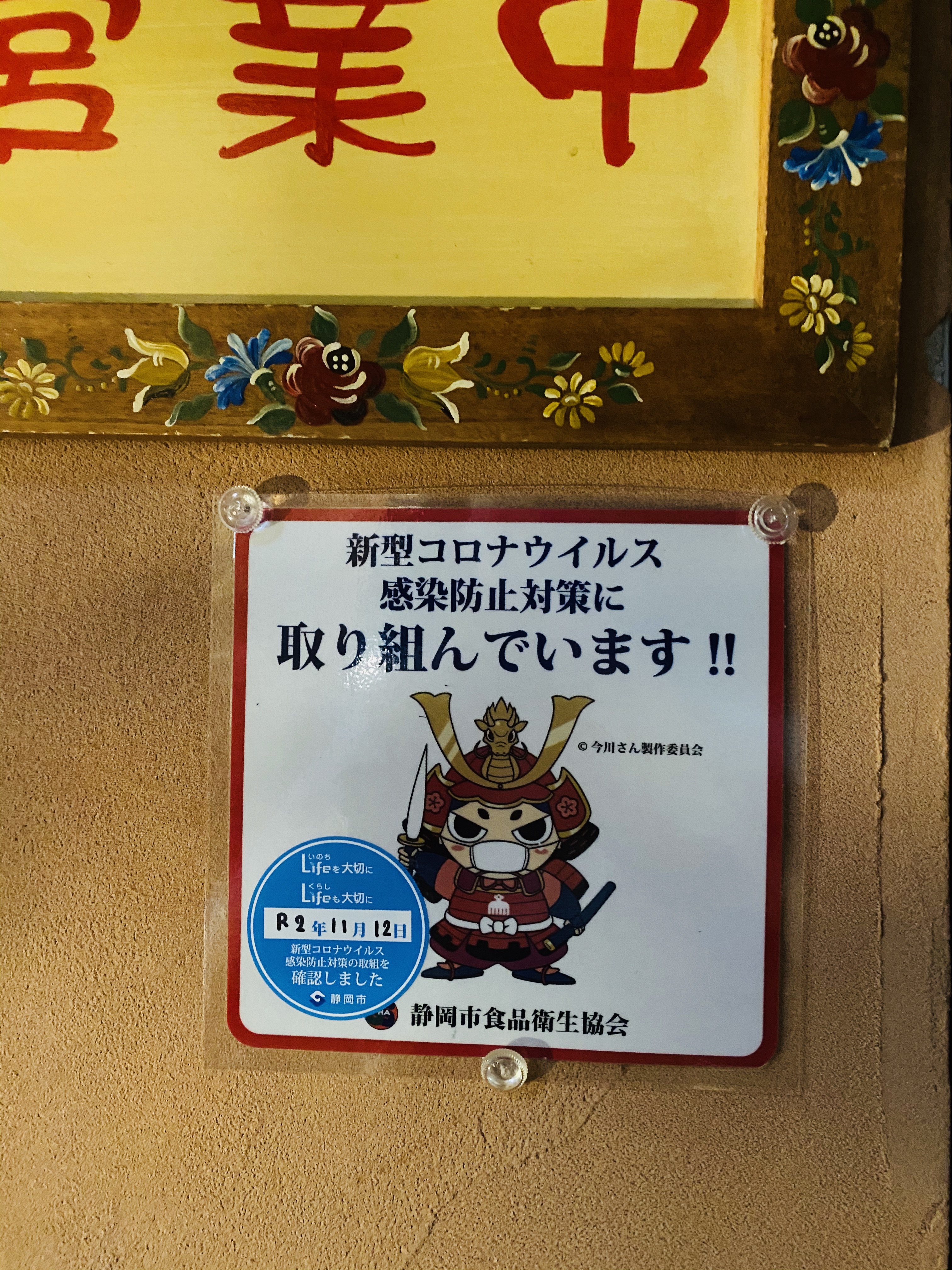 2020年11月12日、静岡市から検査に来ていただき、店内及び従事者のコロナ感染症対策が出来ているかの見ていただきました。充分な取り組みをしているとの言葉と認定のステッカーをいただき、お店の前に表示してあります。